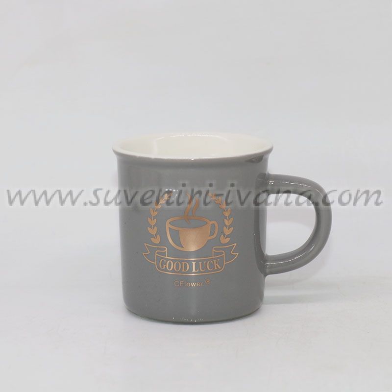 Малка керамична чашка за кафе в сив цвят със златист надпис Good Luck. Вместимост 100 мл.