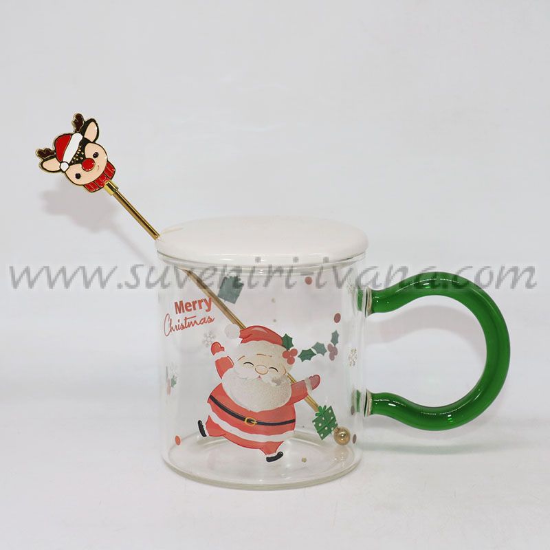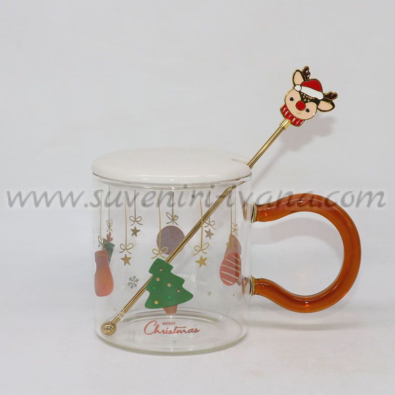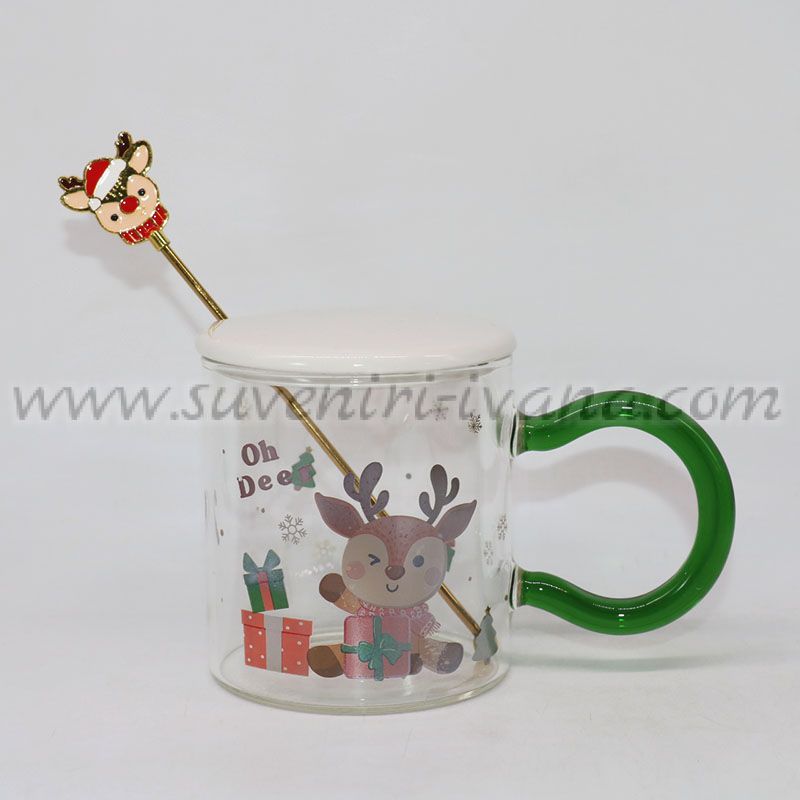 Прозрачна стъклена чаша със забавен коледен дизайн, керамично капаче и бъркалка с фигурка еленче на дръжката. Чашата е чудесен подарък за празниците, както и оригинална декорация за празничната маса или офиса.