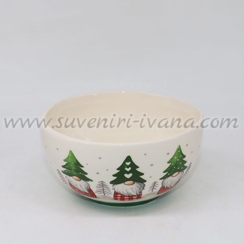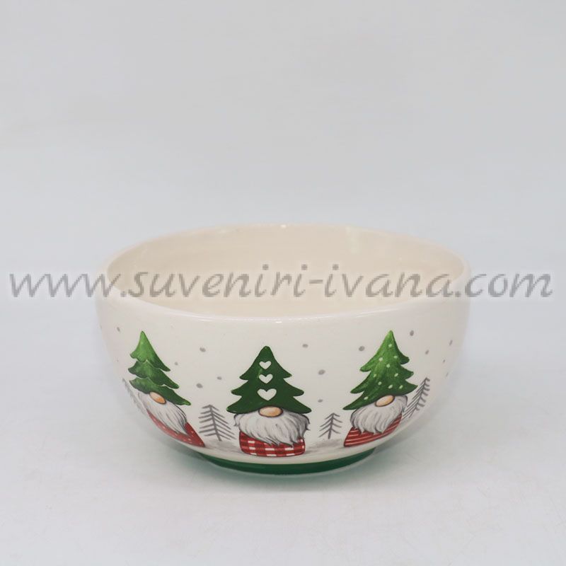 Очарователна коледна купичка от керамика, украсена с джуджета и елхи. Подходяща за сервиране на ядки, десерти, сладки или плодове по време на празниците.