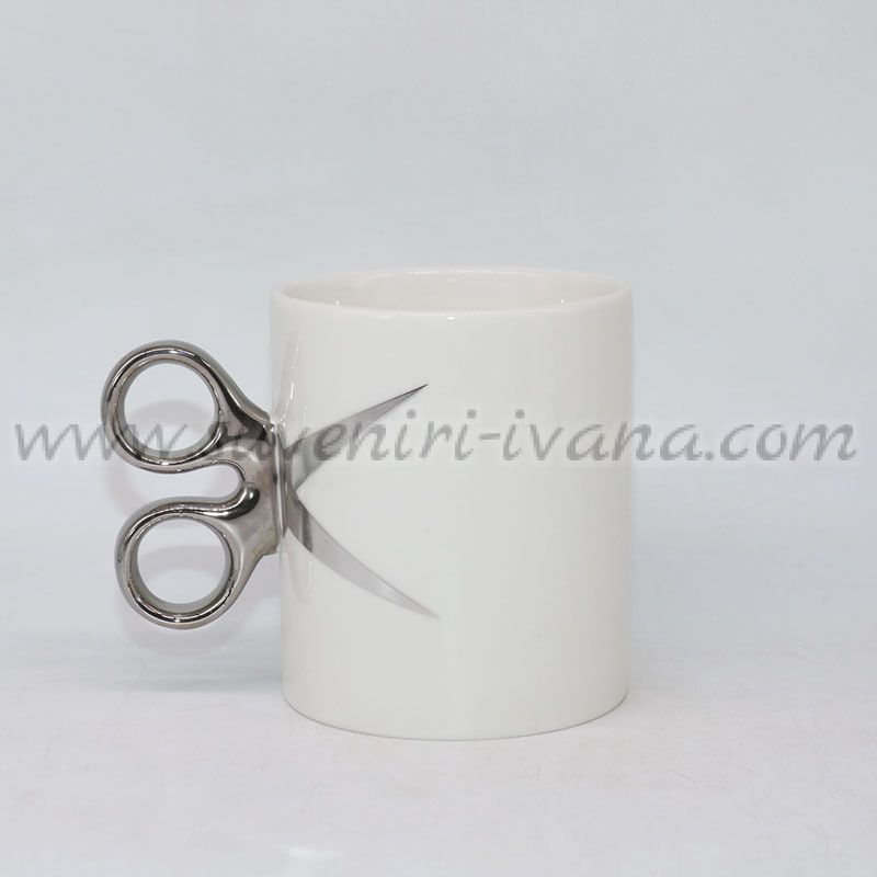 Тази стилна керамична чаша ще впечатли с уникалната си дръжка, оформена като ножица. Комбинацията от бял цвят и сребристи акценти придава елегантност и модерно излъчване. Подходяща е за кафе, чай или горещ шоколад и е чудесен подарък за фризьори, шивачи, дизайнери или просто за хора с творчески дух. Добавете щипка оригиналност към ежедневието си с тази дизайнерска чаша. Размери: 9.5 × 8 см, вместимост около 400 мл.