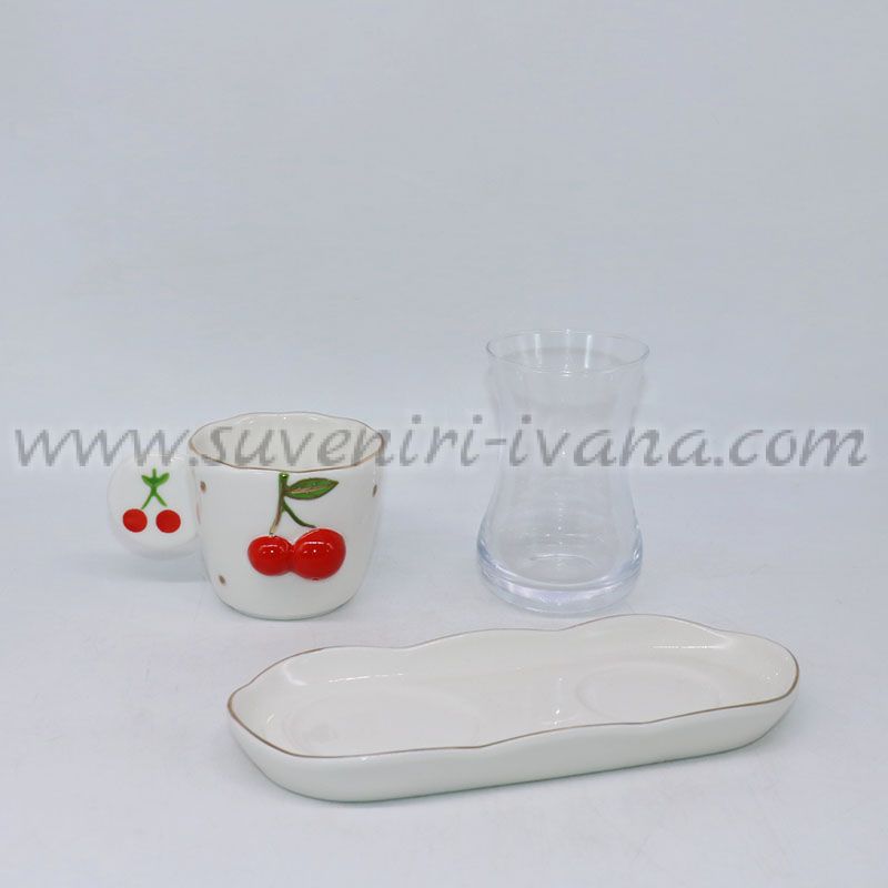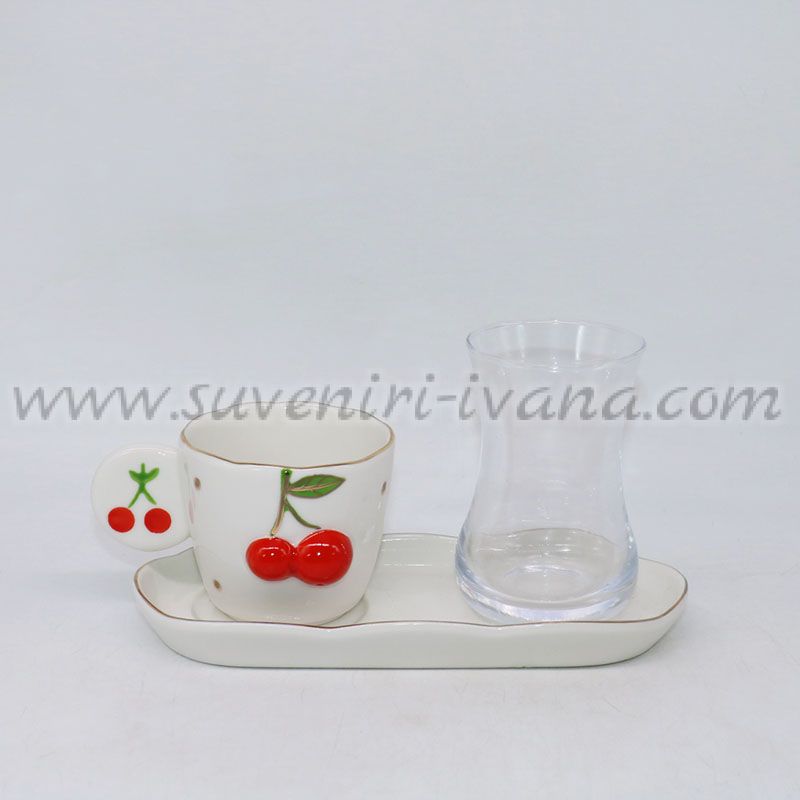 Този стилен комплект за кафе съчетава практичност и свеж дизайн. Керамичната чаша е декорирана с релефни черешки и златист кант, което ѝ придава изискан и весел вид. Стъклената чаша е с елегантна форма и подходяща за сервиране на вода или друга студена напитка към кафето. Всичко това е красиво подредено върху керамична подложка с меки извивки.