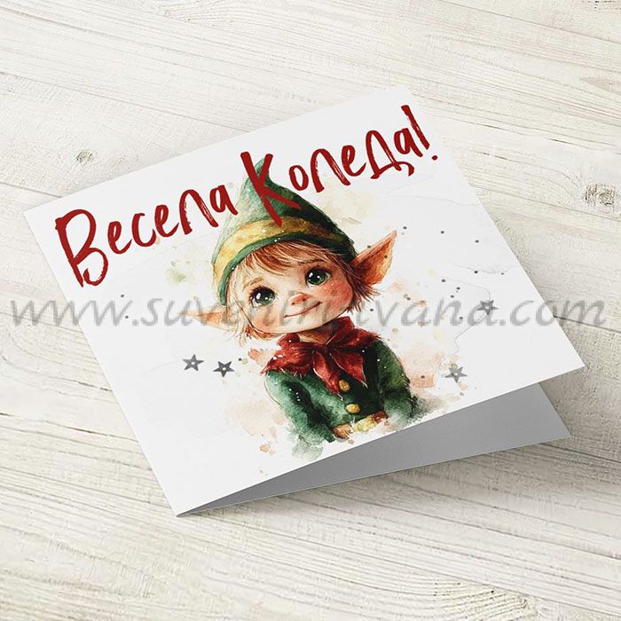 Празнична коледна картичка, изработена от картон с ленени влакна с красив дизайн на коледен елф, обграден от празнични звездички. Надписът „Весела Коледа!“ придава още повече празничен дух.