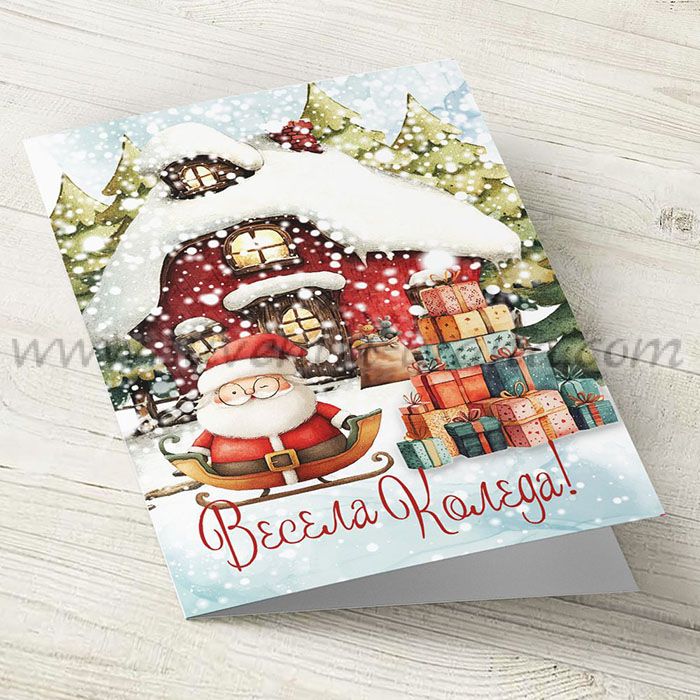 Поздравителна картичка „Дядо Коледа на шейна“ ще внесе празничен дух и усмивки в дома на всеки, който я получи. Надписът „Весела Коледа“ придава още повече празничен дух.