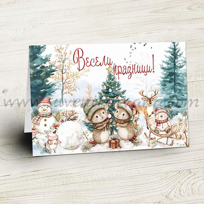 Тази празнична картичка с надпис „Весели празници!“ ще внесе усмивки и настроение във всеки дом. Илюстрацията представя очарователна зимна сцена с две мишлета в коледни шапки, снежен човек, елен и украсена елха – всичко, което създава магията на Коледа. Картичката е с акварелна илюстрация върху еко картон с ленени влакна. Размери 10,0 х 15,0 см. Картичката се предлага в комплект с плик.