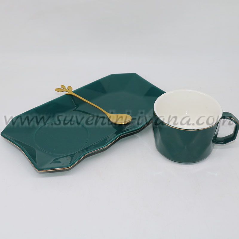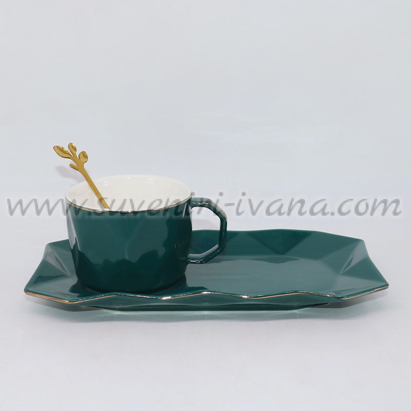 Елегантен комплект за кафе или чай, включващ керамична чаша, чинийка и златиста лъжичка. Изискан дизайн в тъмнозелен цвят с геометрична форма и златен кант.