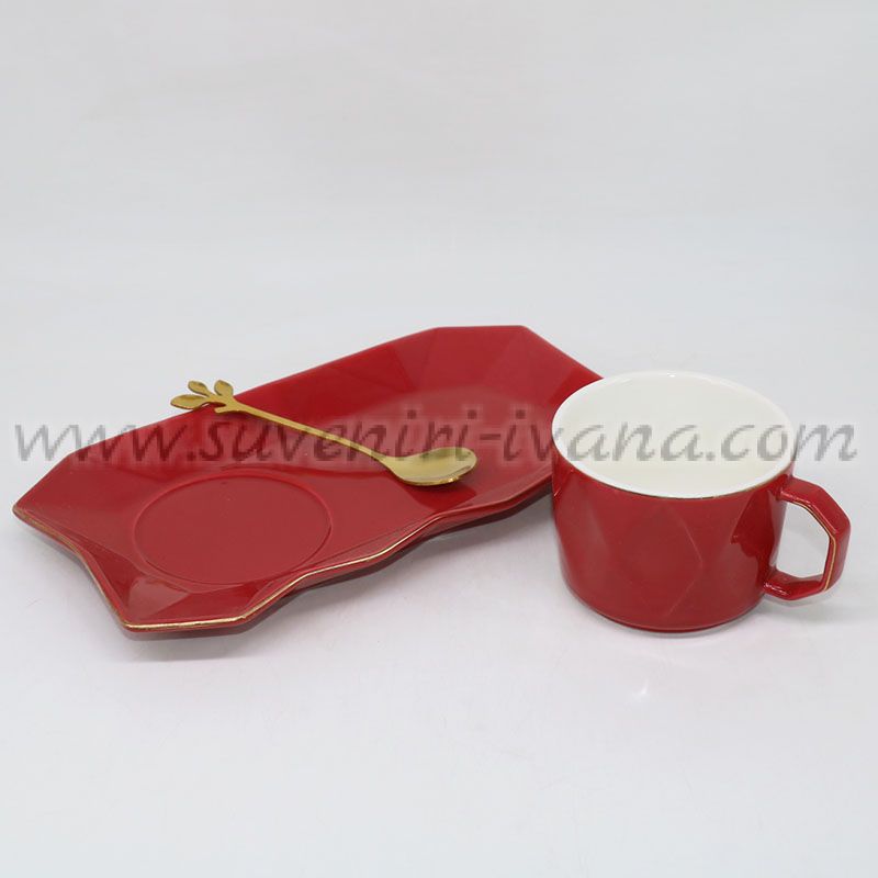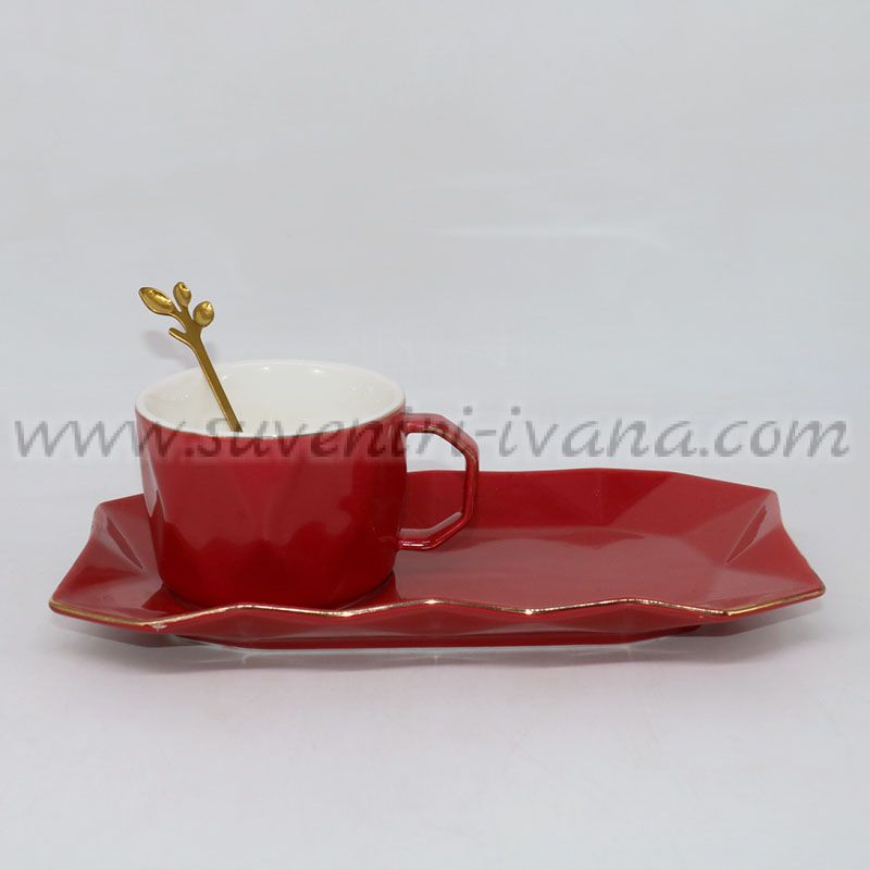 Елегантен комплект за кафе или чай, включващ керамична чаша, чинийка и златиста лъжичка. Изискан дизайн в червен цвят с геометрична форма и златен кант.