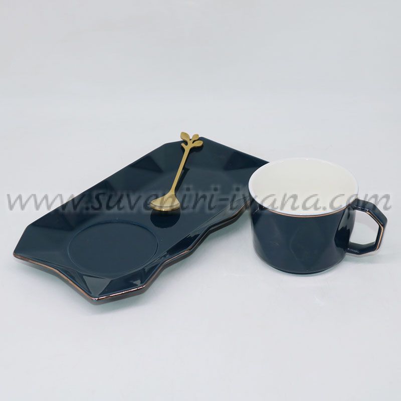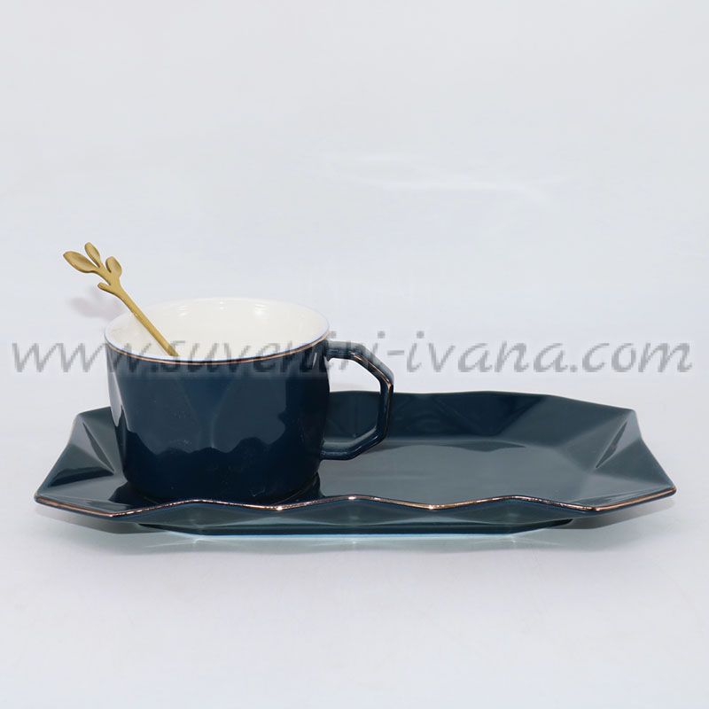 Елегантен комплект за кафе или чай, включващ керамична чаша, чинийка и златиста лъжичка. Изискан дизайн в тъмносин цвят с геометрична форма и златен кант.