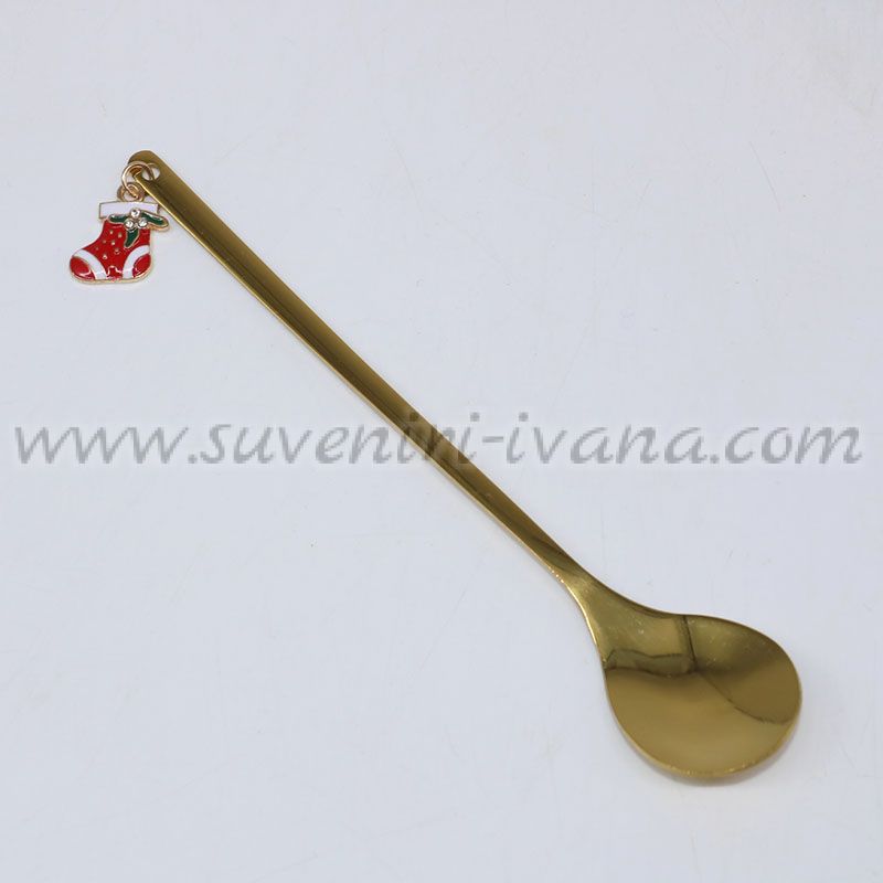 Елегантна златиста лъжичка с декоративен коледен елемент – малко червено чорапче. Подходяща за сервиране на напитки, десерти или като празничен акцент към сервиза ви.