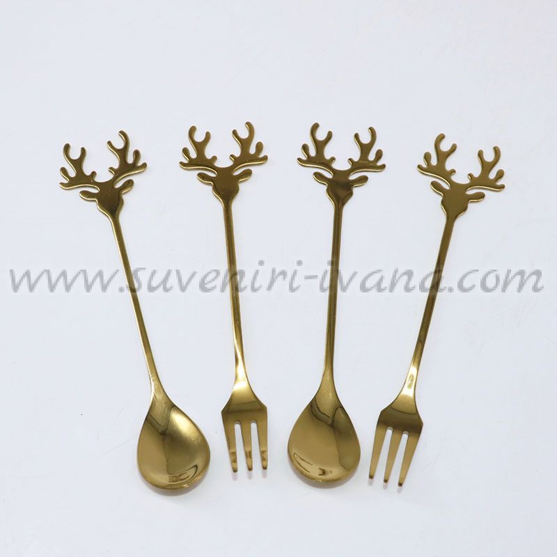 Изискан комплект от златисти лъжички и вилички с декоративни дръжки във формата на еленови рога. Перфектен избор за коледна трапеза или подарък с празнично настроение.
