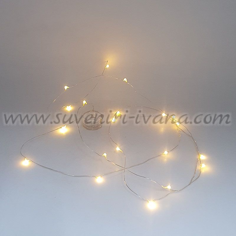 Фина LED гирлянда на гъвкава тел с топла бяла светлина. Идеална за декорация на празници, партита, витрини, цветни композиции или ръчно изработени проекти. Работи с батерии, които са включени в цената.