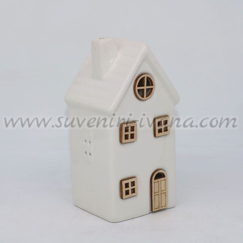 Керамична светеща къщичка с дървени детайли и LED лампичка, модел две