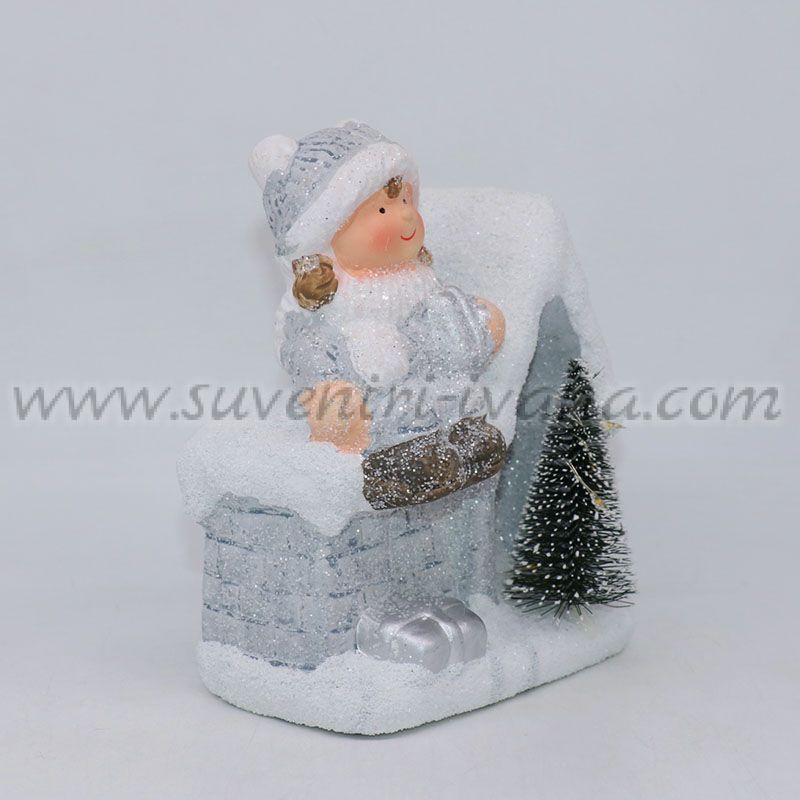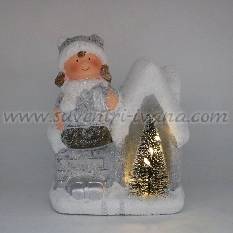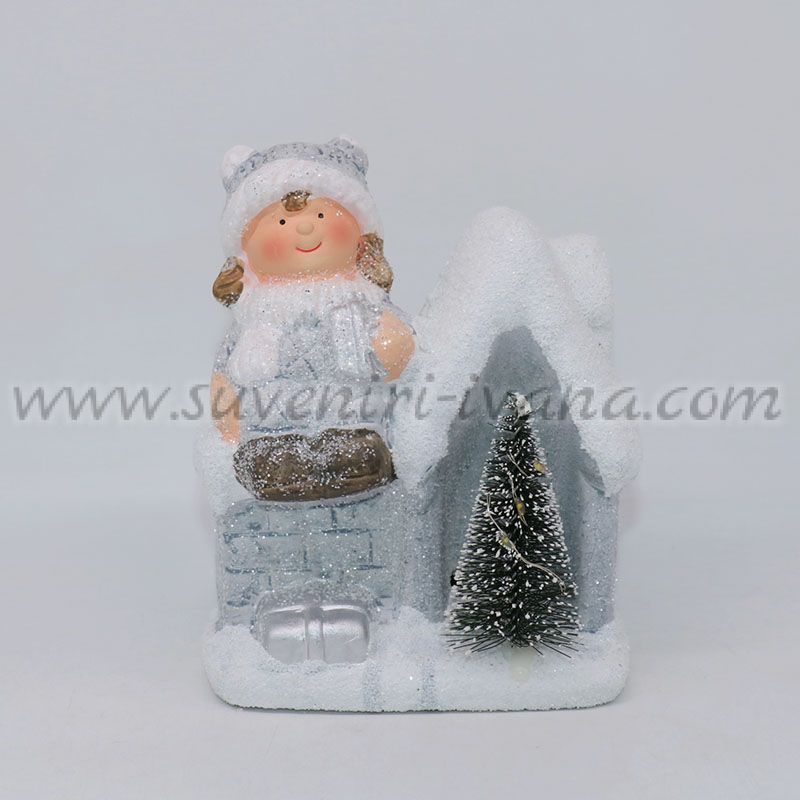 Тази красива светеща коледна фигурка носи уют и топлина във всеки дом. Изработена е от керамика с ефект на снежно покритие и нежни блестящи акценти. Фигурката изобразява усмихнато дете в зимно облекло, седнало до малка къщичка, в която свети миниатюрна елхичка с LED светлина. Работи с батерии, което позволява да я поставите навсякъде – на перваз, маса, рафт или като част от коледен кът.