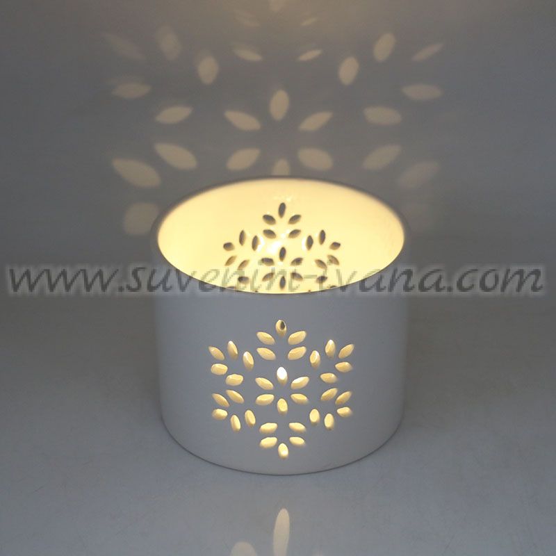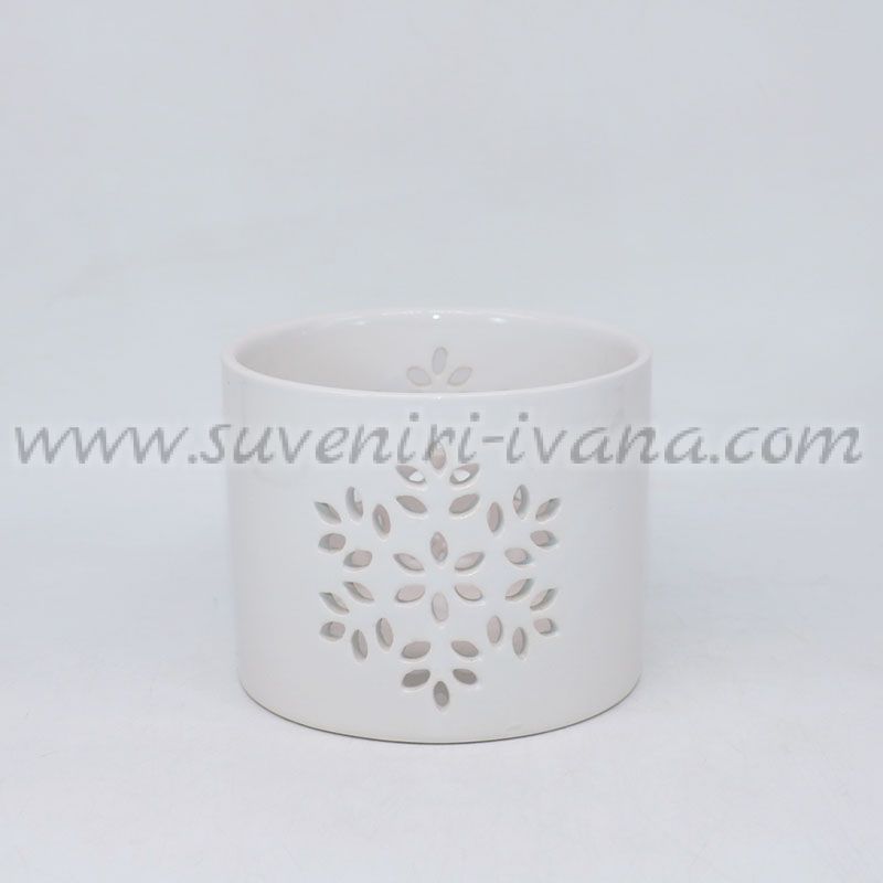 Керамичен свещник с декоративни изрязани мотиви, които създават красив светлинен ефект при запалена чаена или друга подходяща свещ.