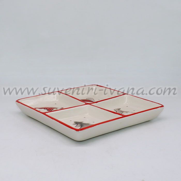 Това красиво керамично плато с четири отделения е идеално за празничната трапеза. Всяко отделение е декорирано с различен коледен мотив – игриви гноми, елхичка и сърце, които създават уют и настроение. Червеният кант придава фин коледен акцент, а разделените секции го правят изключително практично за сервиране на различни видове храни: ядки, бонбони, дипове, маслини и други малки изкушения.