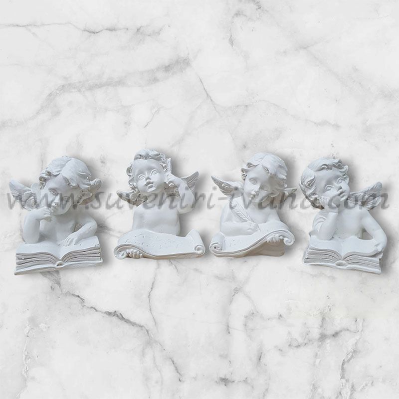Мини фигурки ангелчета, всяко поставено върху книга и в различна поза. Изработени от полирезин, подходящи за коледна декорация, диорами, колекции или подарък. Цената е за един брой ангелче.