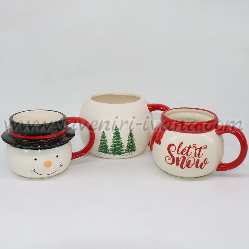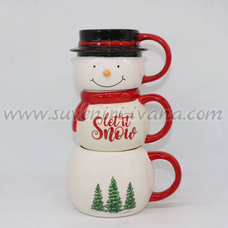 Този празничен комплект включва три керамични чаши, които подредени една върху друга образуват симпатичен снежен човек. Горната чаша е с релефно усмихнато лице и черна шапка, средната носи надпис „Let it Snow“, а долната е декорирана със зелени елхички.