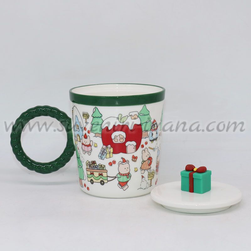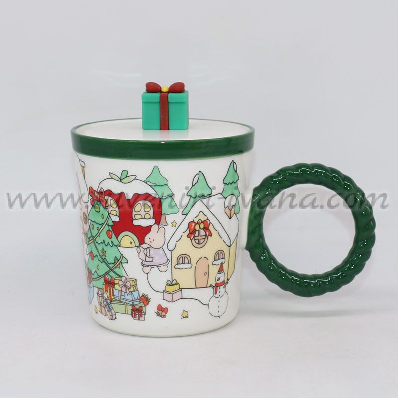 Празнична керамична чаша с коледни мотиви, капаче с подарък и оригинална зелена дръжка във формата на венец.