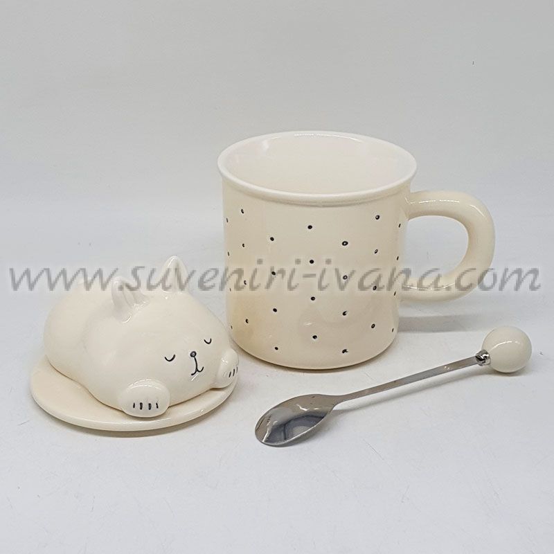 Очарователна керамична чаша с капаче във формата на коте и метална лъжичка. Подходяща за кафе, чай или подарък. Вместимост приблизително 400 мл.