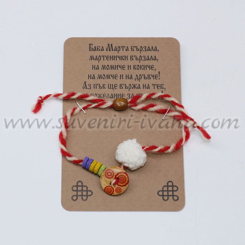 Мартеничка за връзване на ръка с дървени мъниста, копче и бял пискюл. Мартеницата е ръчно изработена от вълнена прежда. Предлага се с картонче с първомартенско стихче от предната страна и кратка легенда за мартеницата от задната.