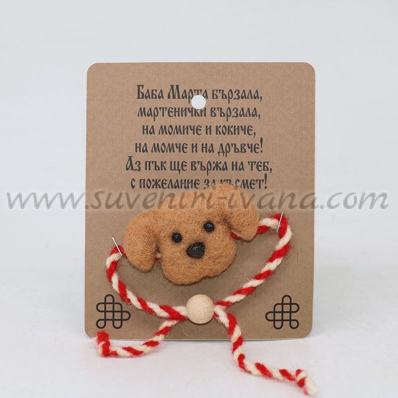 Мартеничка за връзване на ръка с кученце от филц и дървено мънисто. Предлага се с картонче с първомартенско стихче от предната страна и кратка легенда за мартеницата от задната.