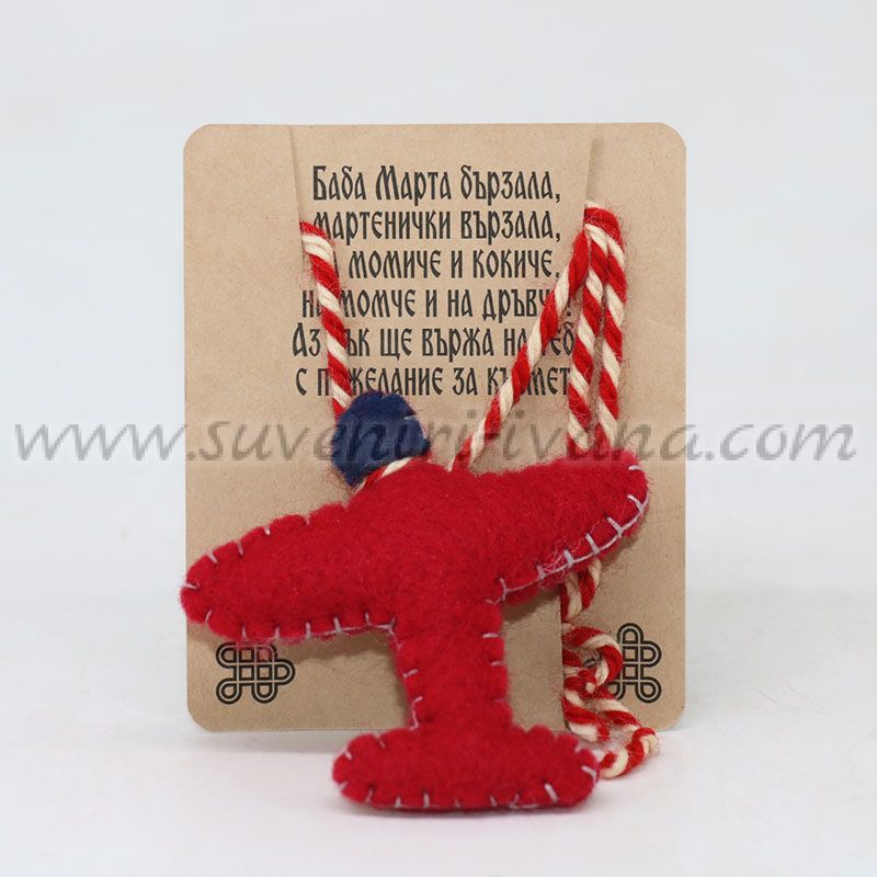 Мартеница тип гердан със самолет, изработен от филц. Мартеничката се предлага в целофанено пликче и картонче с първомартенско стихче от предната страна и кратка легенда за мартеницата от задната.
