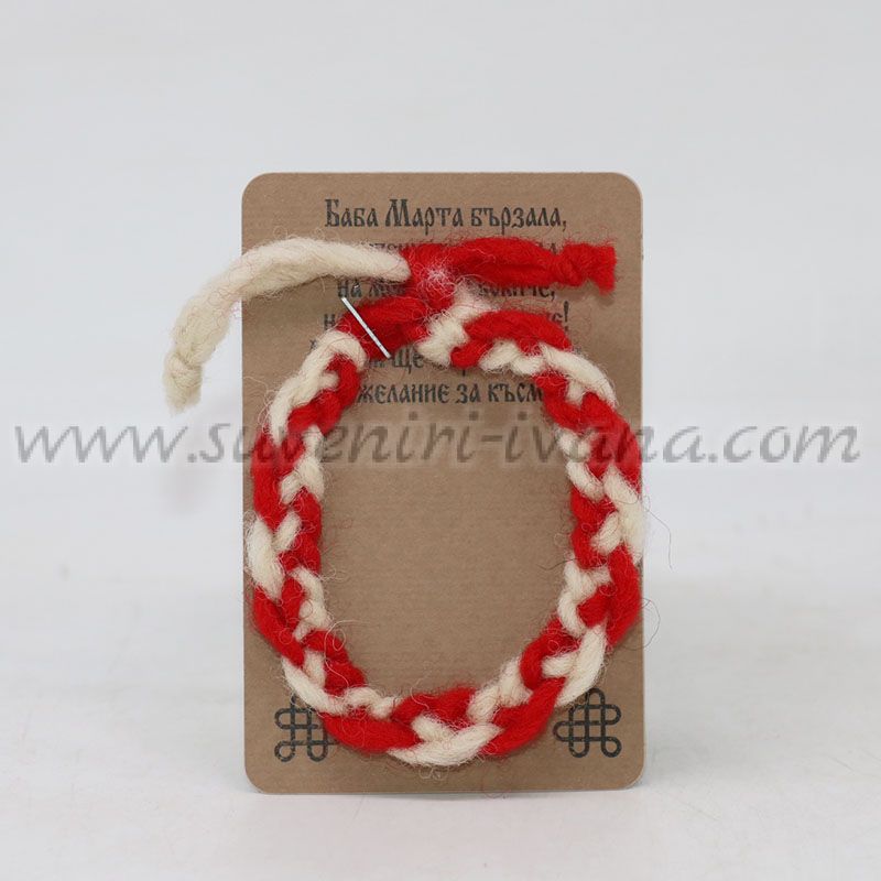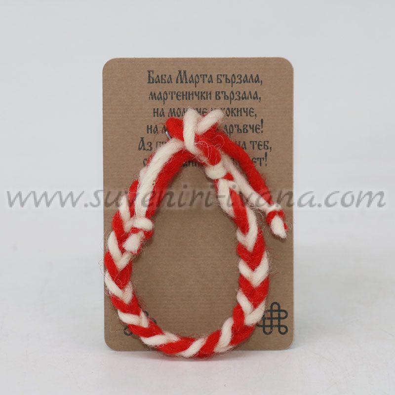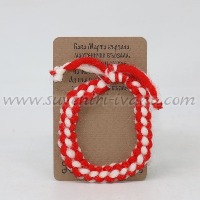 Класическа мартеница тип гривна от усукани червено-бели вълнени конци, поднесена с пожелание за здраве и късмет.