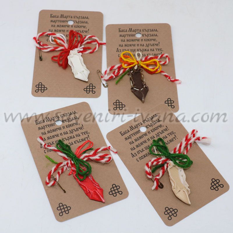 Традиционна мартеница с декоративна кожена цървулка в различни цветове, поднесена с пожелание за здраве и късмет върху картонче от крафт картон. Продава се на бройка – снимката показва всички налични варианти.