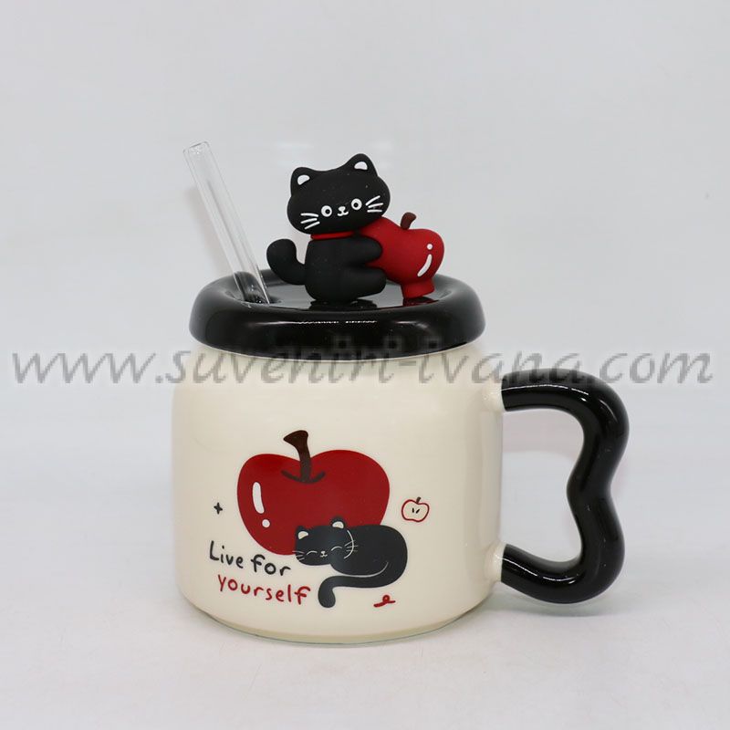 Бяла керамична чаша с коте, черна дръжка във формата на сърце, капак с фигурка черно коте и стъклена сламка. Вместимост около 400 мл.