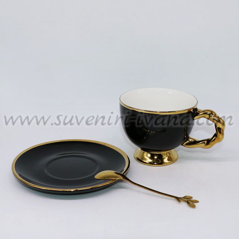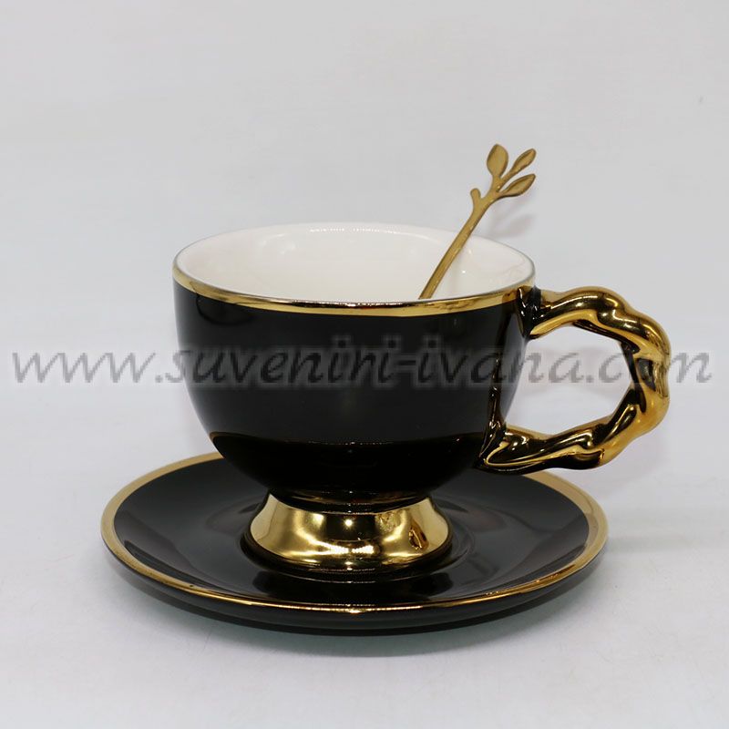 Комплект луксозна черна чаша със златиста дръжка и основа плюс чинийка и лъжичка