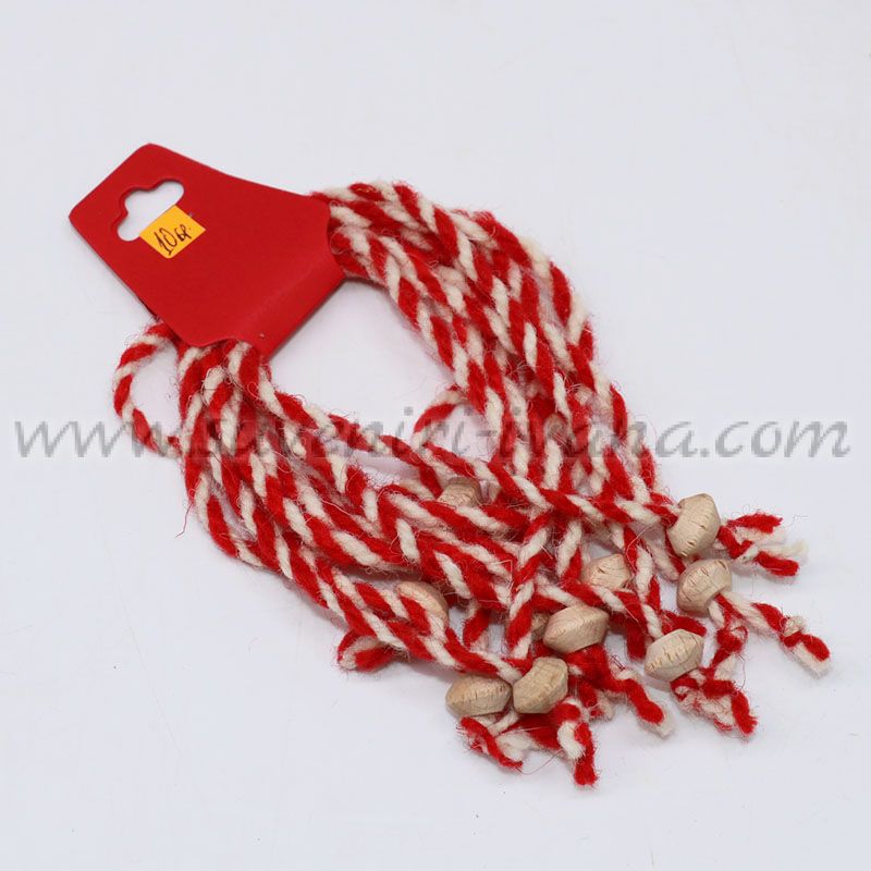 Мартеници на едро – практичен комплект от 10 броя гривни, изработени от традиционен усукан бял и червен конец и декорирани с дървено мънисто. Подходящи за търговци, фирми, детски градини и училища, които търсят достъпни и стилни мартеници за раздаване по случай 1 март.