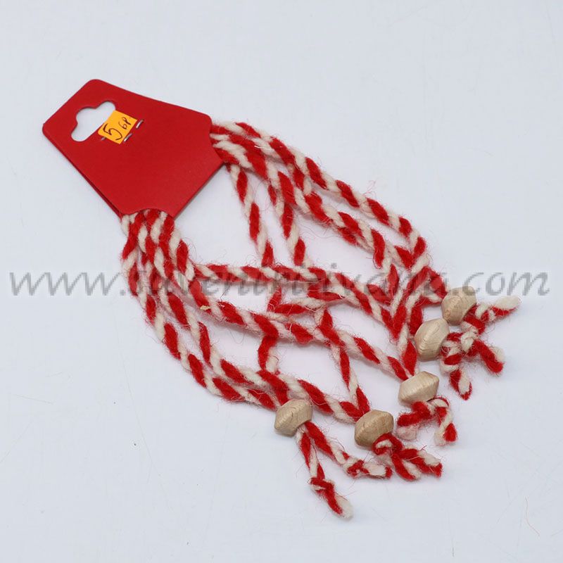 Мартеници на едро – практичен комплект от 5 броя гривни, изработени от традиционен усукан бял и червен конец и декорирани с дървено мънисто. Подходящи за търговци, фирми, детски градини и училища, които търсят достъпни и стилни мартеници за раздаване по случай 1 март.