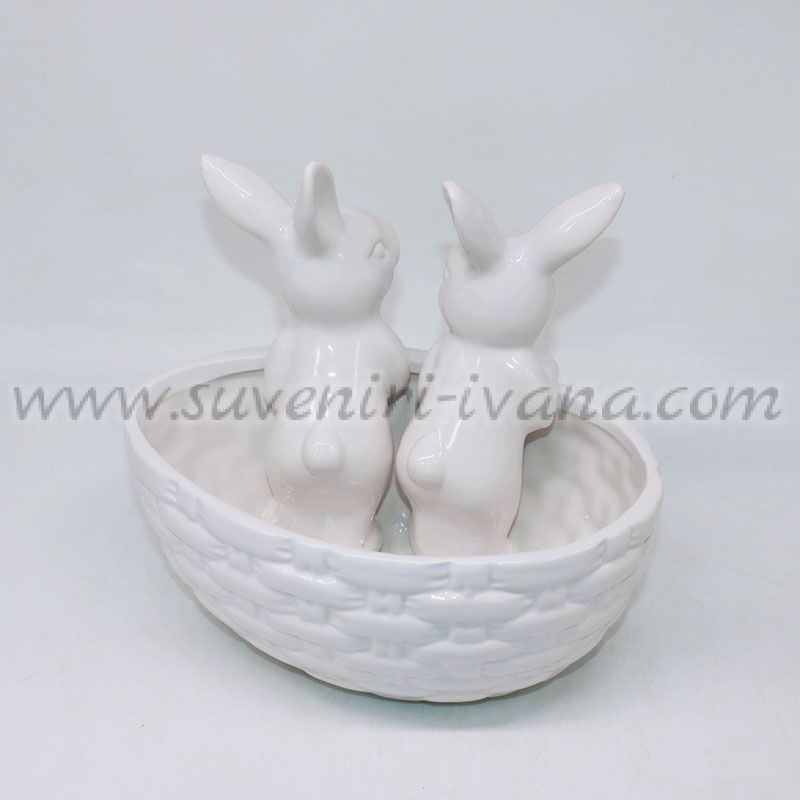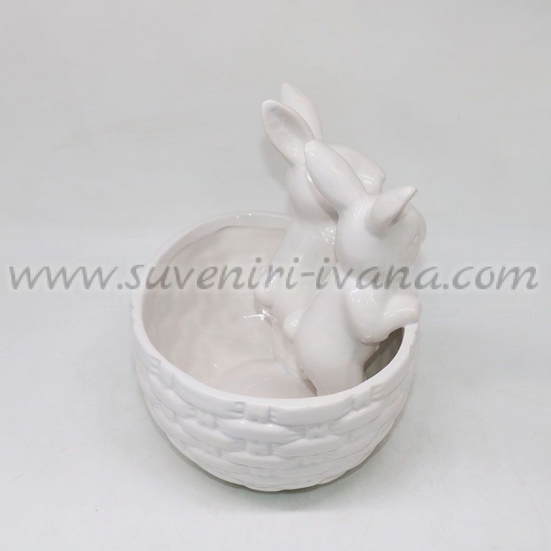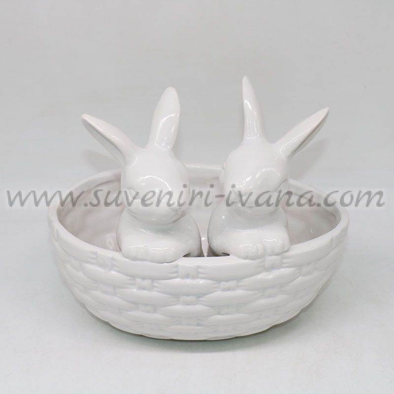 Красива керамична кошница в бял цвят с релеф, имитиращ плетена кошница, декорирана с две нежни зайчета. Изчистеният дизайн и гланцовото покритие я правят елегантен акцент за празничната маса или интериора. Фигурките на зайчетата придават чар и уют, а неутралният бял цвят позволява лесно комбиниране с други декорации.