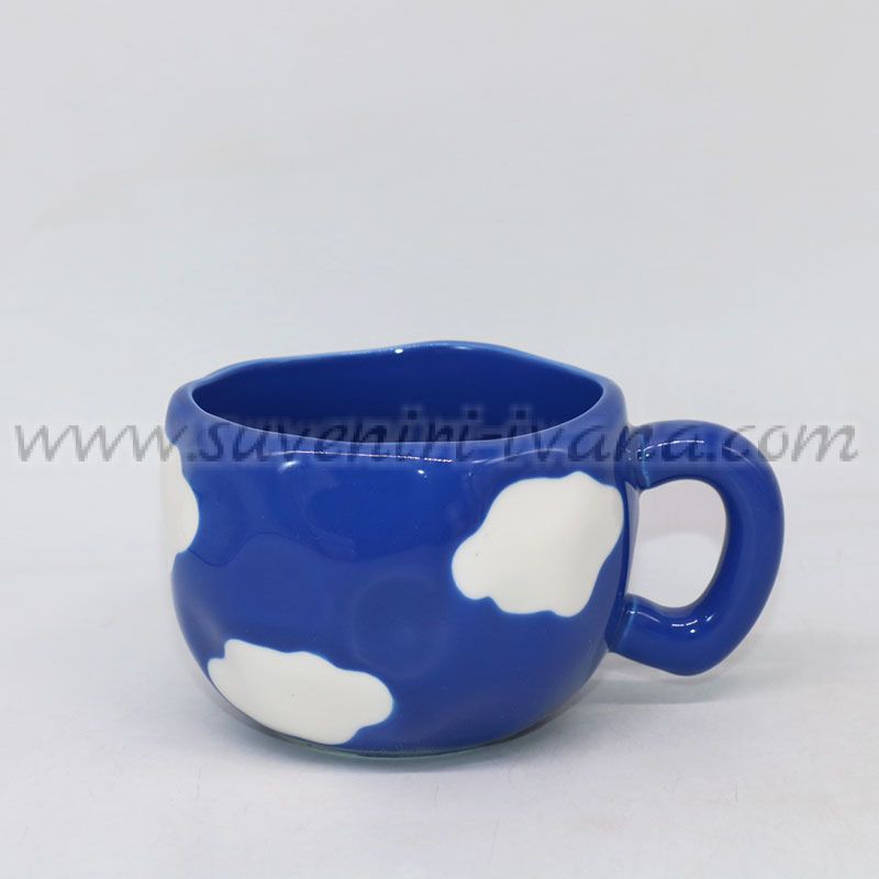 Нежна керамична чаша в наситен син цвят с бели облачета – идеална за уютни сутрини и сладки моменти с любима напитка. Вместимост около 300 мл.