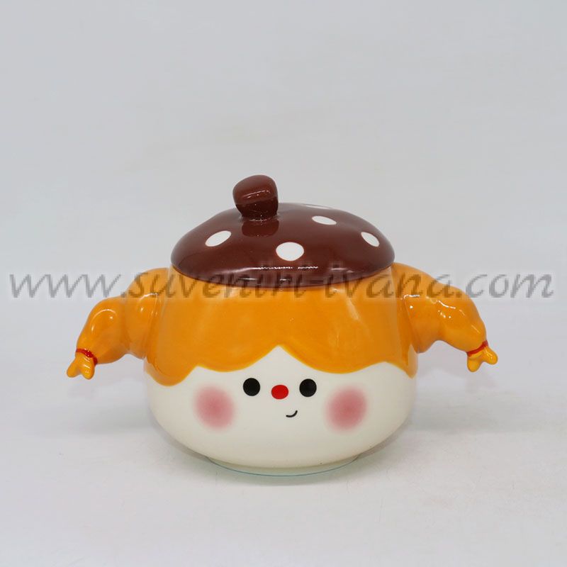 Оригинална керамична чаша с капак във форма на сладко момиче с шапка гъбка. Подходяща както за напитки, така и като декоративна захарничка. Вместимост около 300 мл.