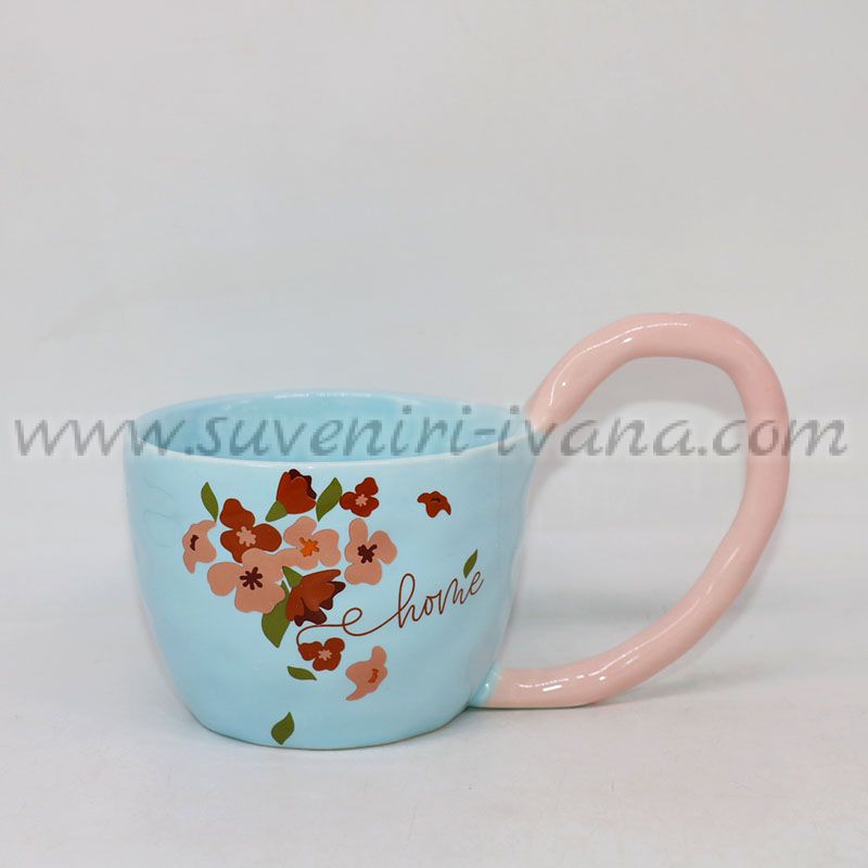 Тази керамична чаша впечатлява с мек пастелно син цвят, красив флорален мотив и надпис „Home“, който носи усещане за топлина и спокойствие. Контрастната светлорозова дръжка добавя фин и модерен акцент, правейки чашата още по-очарователна.
