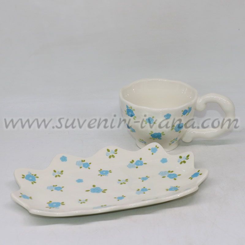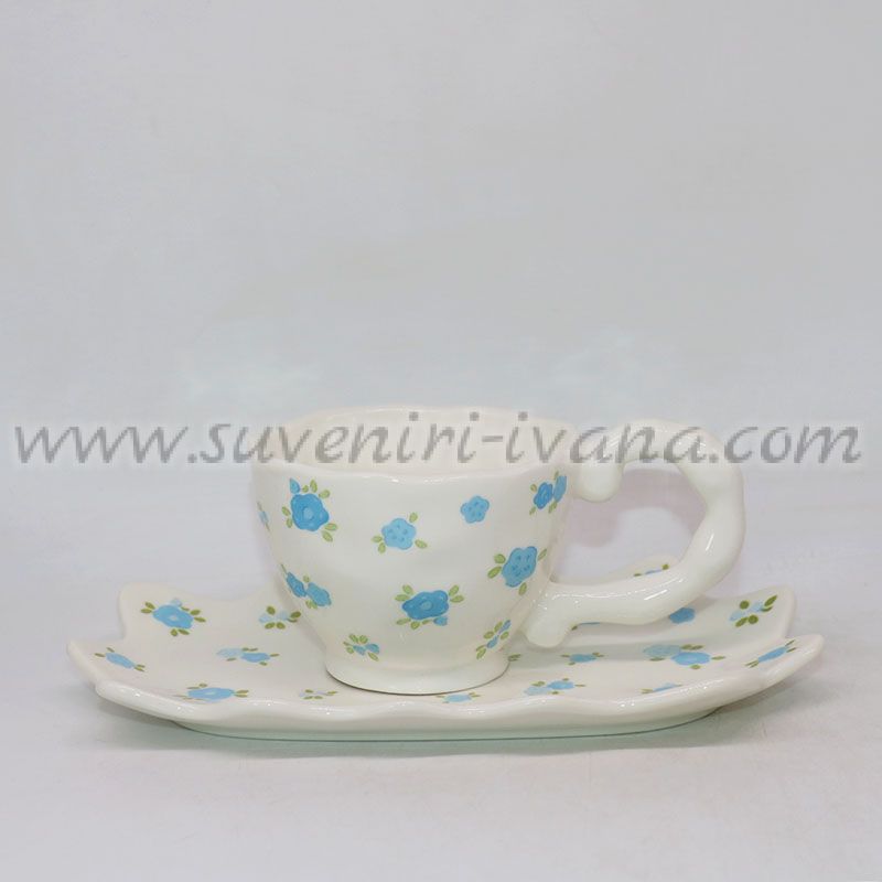 Този керамичен комплект включва стилна чашка и чинийка с хармоничен флорален мотив в сини и зелени нюанси. Формата на чинийката придава оригиналност и естетика, а деликатният дизайн носи усещане за лекота и пролетен уют.