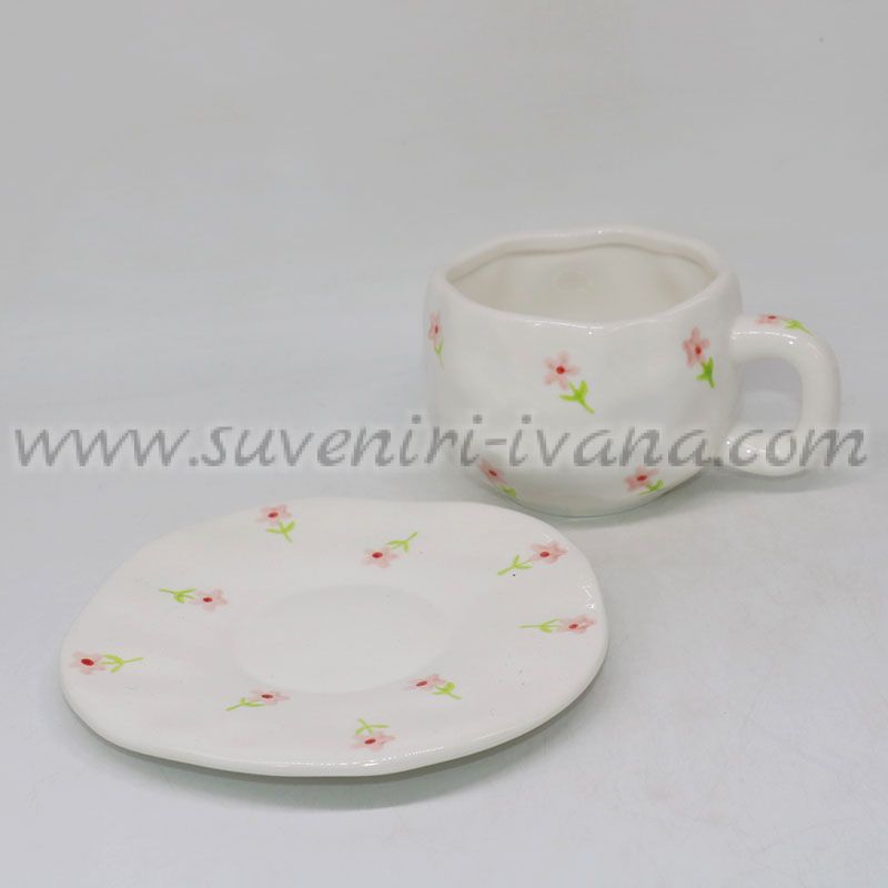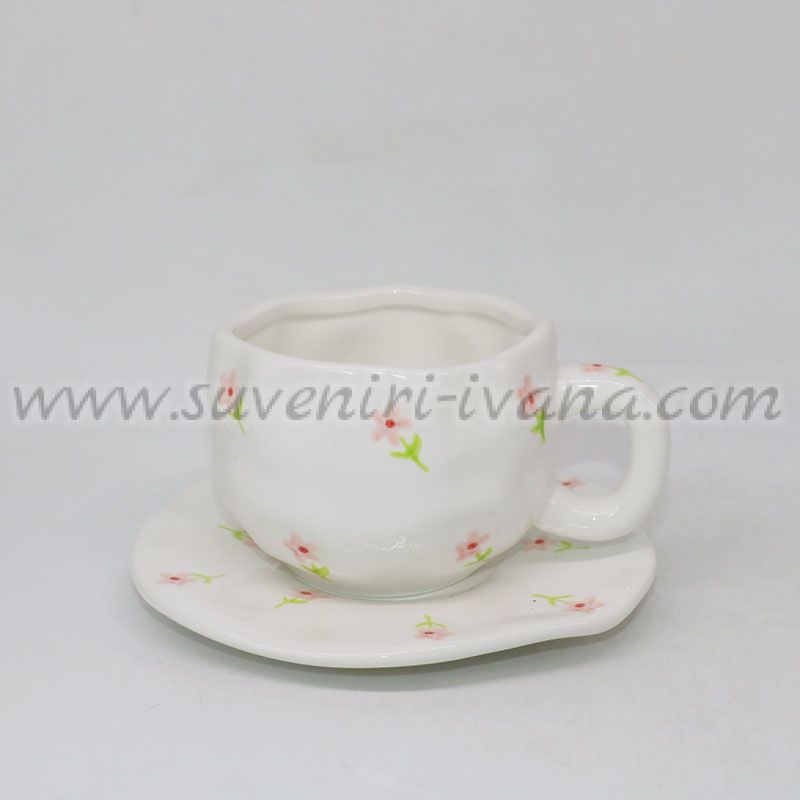 Този керамичен комплект включва стилна чашка и чинийка с пролетен мотив - малки розови цветенца. Формата на чинийката придава оригиналност и естетика, а деликатният дизайн носи усещане за свежест и пролетно настроение.