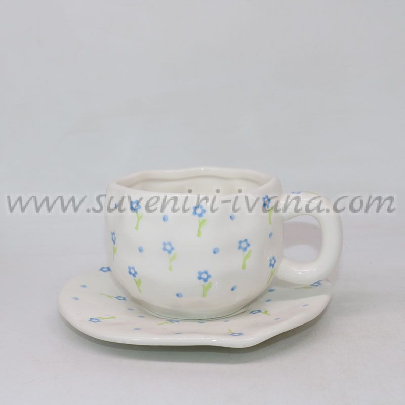 Този керамичен комплект включва стилна чашка и чинийка с пролетен мотив - малки сини цветенца. Формата на чинийката придава оригиналност и естетика, а деликатният дизайн носи усещане за свежест и пролетно настроение.