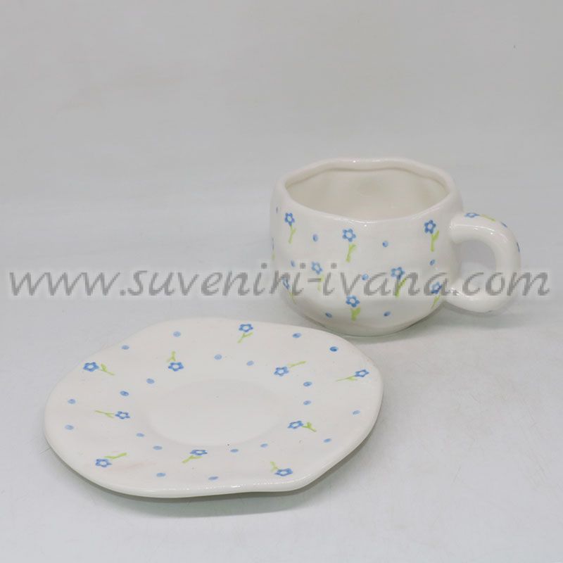 Пролетен керамичен комплект от чашка и чинийка с малки сини цветенца – идеален за кафе или чай. Вместимост на чашата около 300 мл.