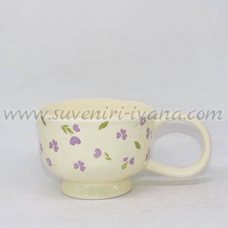 Тази керамична чаша впечатлява със своя топъл кремав цвят и деликатни лилави цветчета, които ѝ придават свеж и романтичен характер. Леко вълнообразният ръб и стабилната основа допълват естетиката ѝ и създават усещане за уют и домашен комфорт.