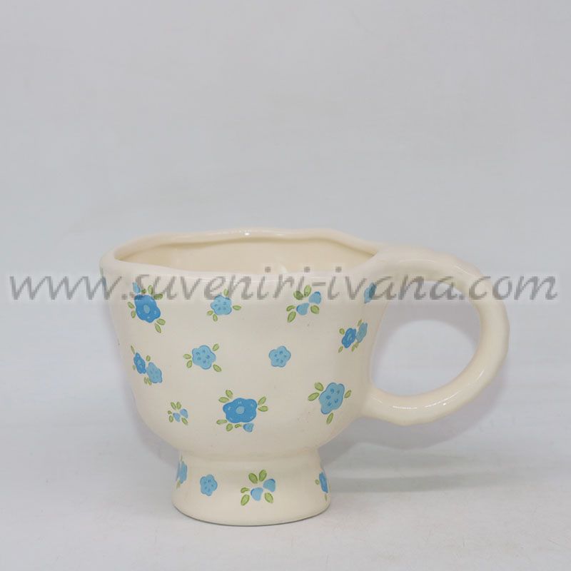 Тази керамична чаша впечатлява със своята изчистена линия и стабилна, леко повдигната основа, която ѝ придава по-елегантен силует. Деликатните сини цветчета и малките зелени листенца създават свежо и пролетно излъчване, подходящо за уютни сутрини с кафе или следобеден чай.