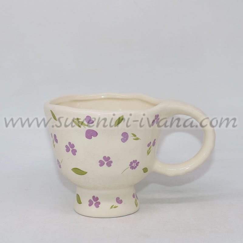 Нежна керамична чаша в светъл кремав тон с лилави флорални мотиви и елегантна основа - идеална за кафе, чай, капучино и други напитки. Вместимост около 300 мл.