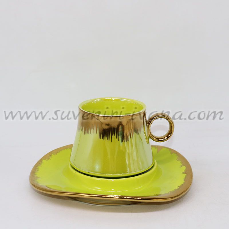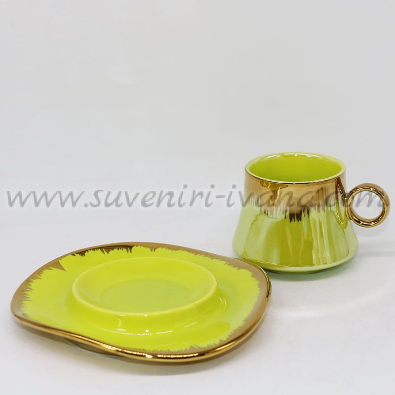 Луксозна порцеланова чаша с чинийка в електриково зелено и златно