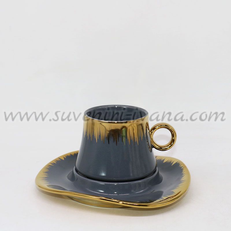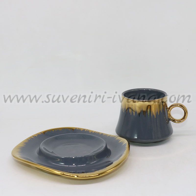 Изискана порцеланова чаша с чинийка, съчетаваща класически сив цвят с ефектни златисти детайли. Фините златни линии по ръба на чашата и чинийката, както и златната дръжка, придават луксозен и модерен вид.