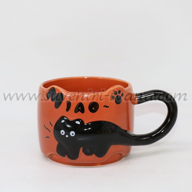 Тази керамична чаша впечатлява с релефен 3D елемент във формата на черна котка, който придава уникален и забавен характер на модела. Оранжевата основа и черната дръжка създават силен контраст и модерно излъчване.