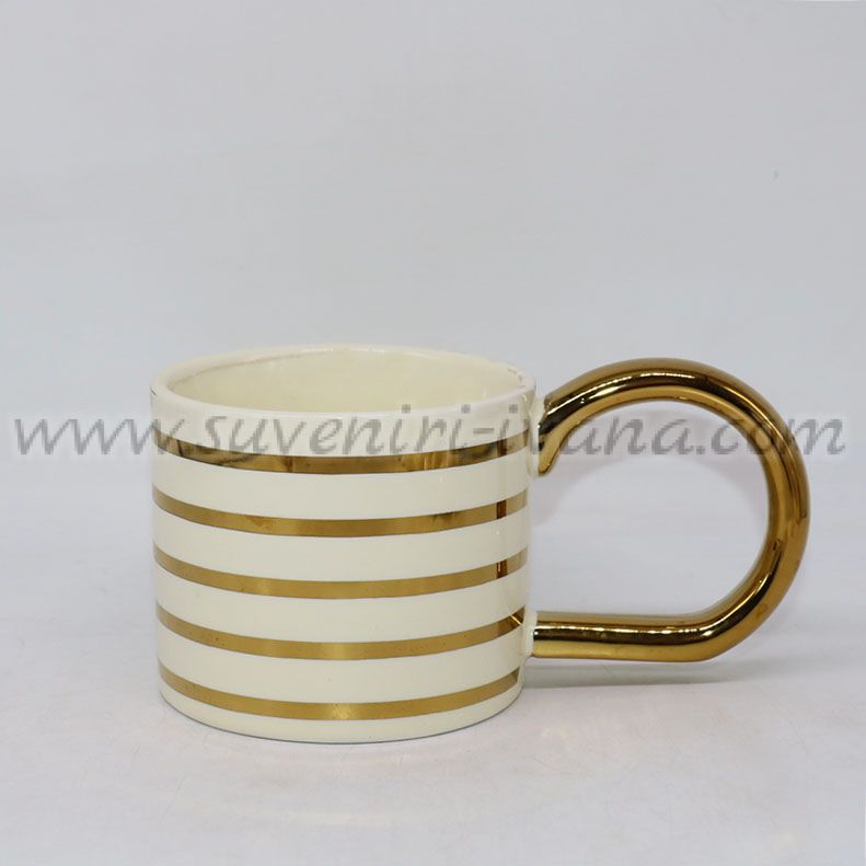 Стилна керамична чаша в нежен кремав цвят със златисти декоративни линии и луксозна златна дръжка – елегантен избор за кафе или чай у дома или в офиса.