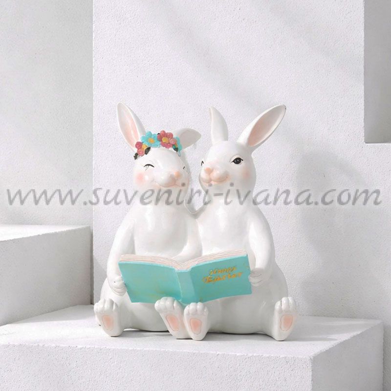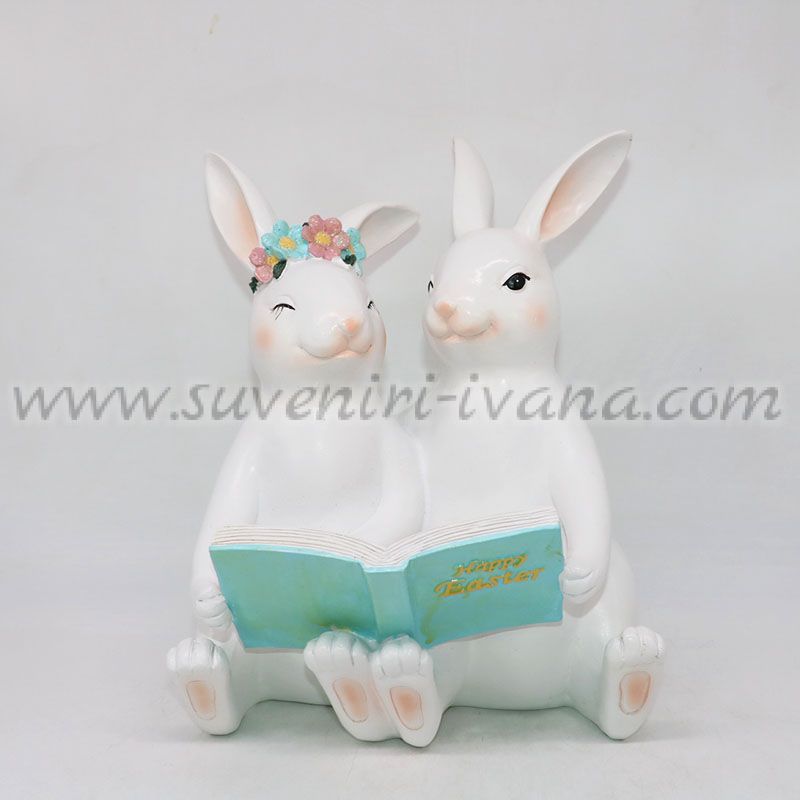 Очарователна великденска фигурка с две зайчета, която ще внесе празнично настроение и пролетна свежест във вашия дом. Декорацията представя зайче с венец от цветя на главата, придружено от второ зайче и двете четящи книжка, на корицата на която пише "Happy Easter".