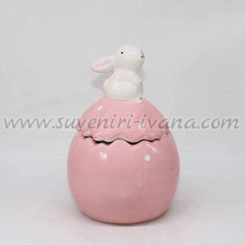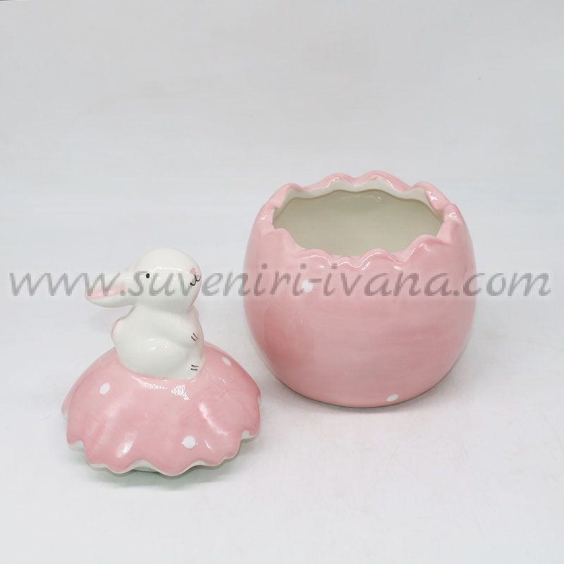 Очарователно керамично бурканче във формата на яйце с нежен розов цвят и капак, украсен с малко зайче. Дизайнът е игрив и празничен, съчетаващ символите на Великден – яйце и зайче – в една стилна композиция.