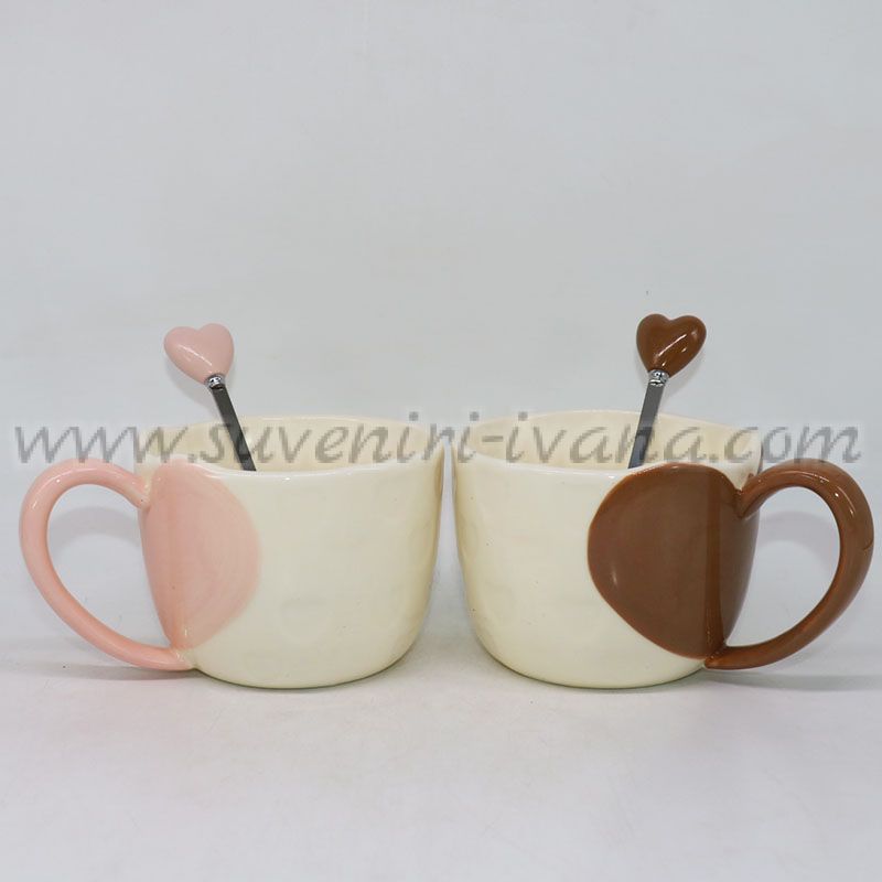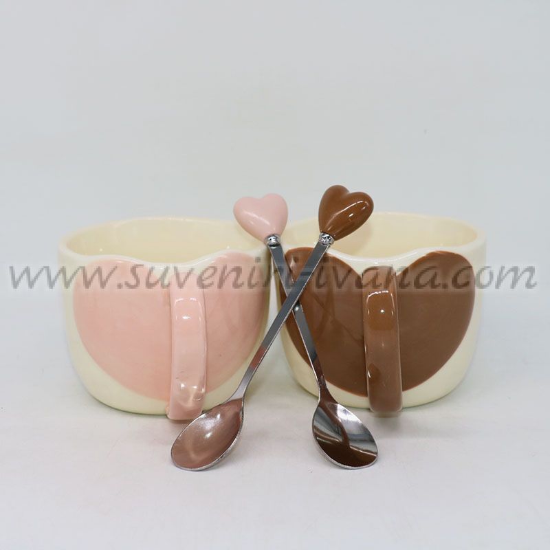 Елегантен комплект от две чаши със сърца в кафяво и розово, допълнен с две лъжички – идеален подарък за влюбени. Вместимост на чашите около 350 мл.