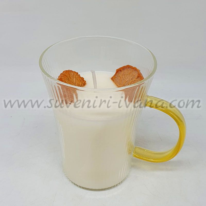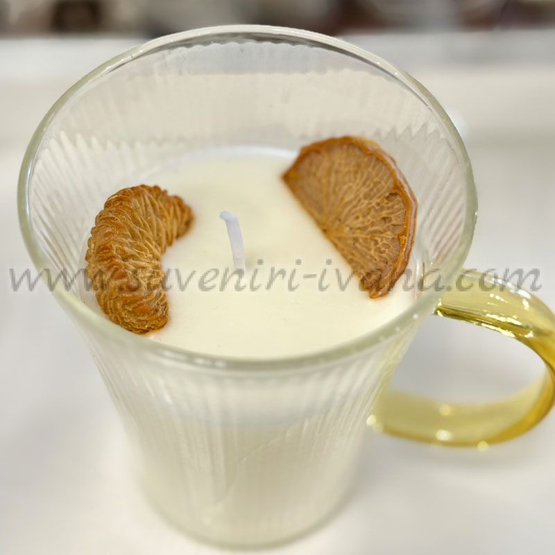 Свещта е ръчно излята от натурален растителен восък и е снабдена с памучен фитил за чисто и равномерно горене. Стъклената чаша с удобна дръжка я прави стилен акцент за всяко помещение.